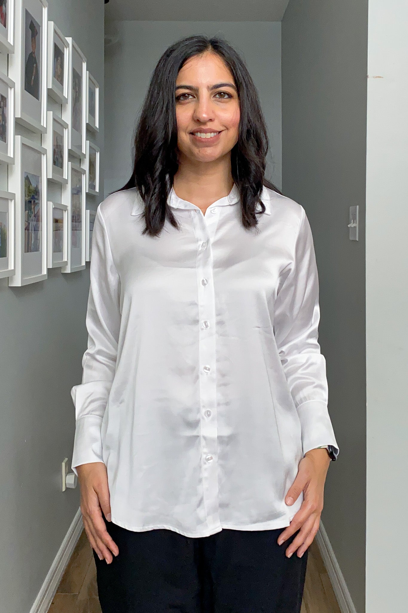 Long sleeve satin button down shirt in ivory in luxe satin material. Timeless button down design and long sleeves for extra coverage.