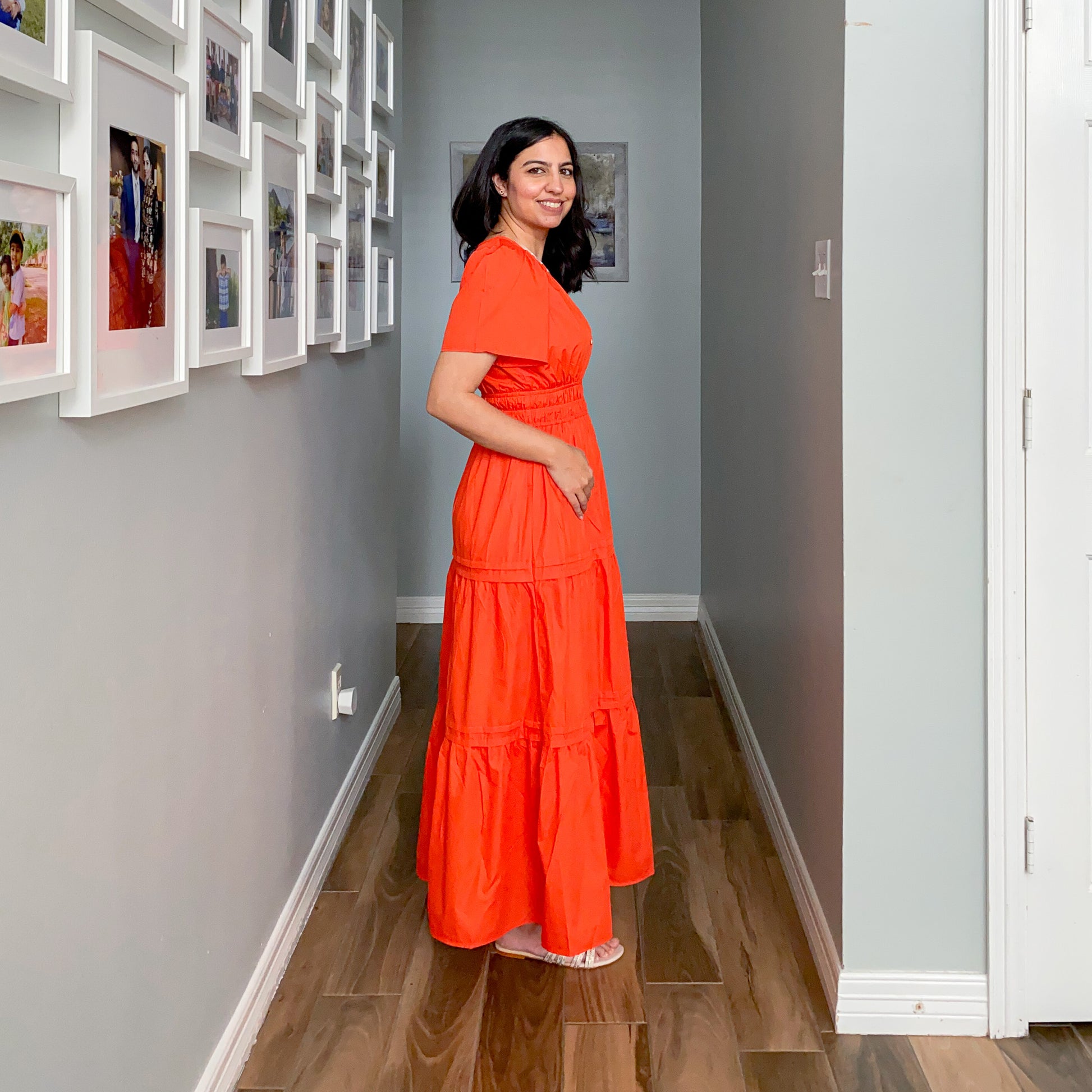 Fiery orange maxi dress in breezy cotton. This long dress features short sleeves, a smocked elastic waist, and a tiered skirt cascading to the floor.