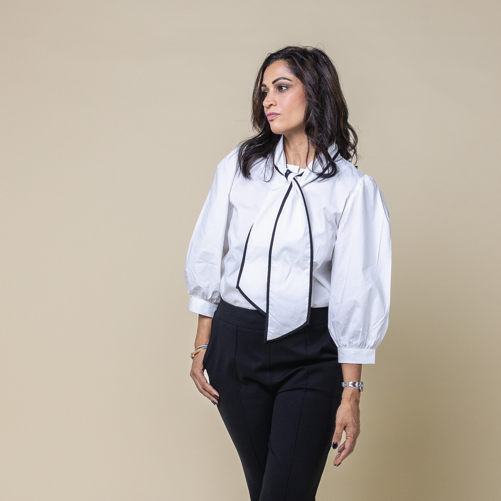 Step into confidence in this white button down shirt featuring 3/4 puff sleeves and a refined tie neck with piping detail. Crafted from breathable cotton, this versatile piece is perfect for a polished, professional look that balances style and comfort.